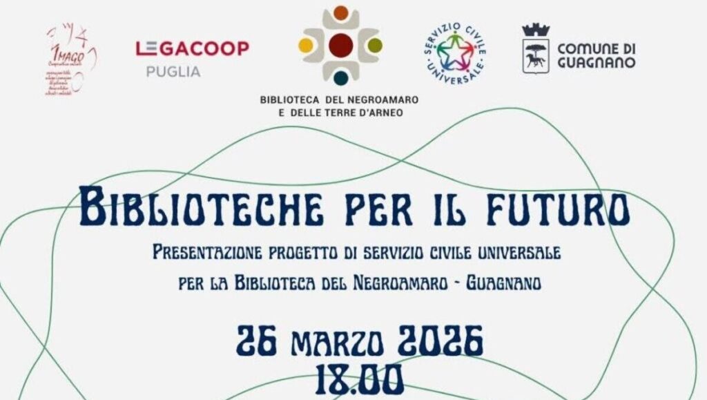 Nella giornata di domani, giovedì 26 marzo alle 18.00, presso la Biblioteca del Negroamaro e delle Terre d’Arneo di Guagnano, in via Pio XII, si svolgerà un incontro informativo volto ad illustrare le opportunità legate al Servizio Civile Universale, un percorso di volontariato e cittadinanza attiva della durata di un anno, destinato ai ragazzi e alle ragazze dai 18 ai 29 anni, che prevede un rimborso spese mensile di 519,47 €.